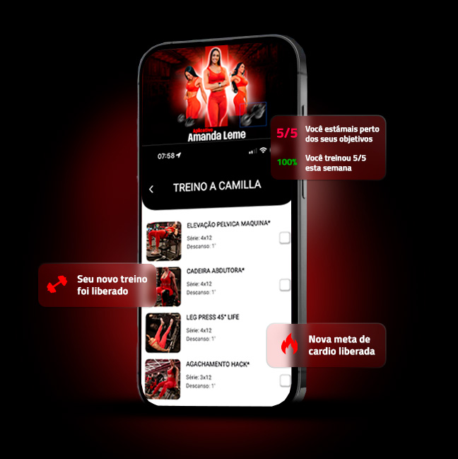 Você terá acesso direto a Amanda Leme através do WhatsApp, onde poderá enviar vídeos dos seus treinos para correção de técnicas. Amanda também oferece explicações detalhadas nos vídeos do aplicativo.
